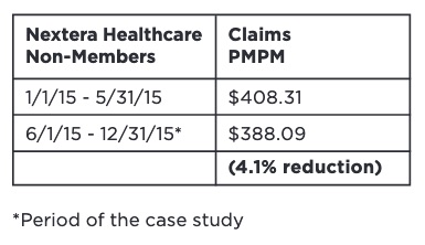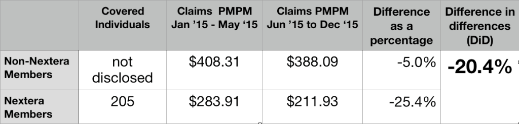 The differences in claims cost sharing are not mentioned or included in the Nextera KPI. Ninja report . As a result, that report attributes those dollars to the efficiency of the Nextera clinic. Correcting that $159 PMPY misattribution reduces Nextera’s savings brag to $ 36 PMPY, rather than $913 PMPY. That’s about 1% rather than 28%.