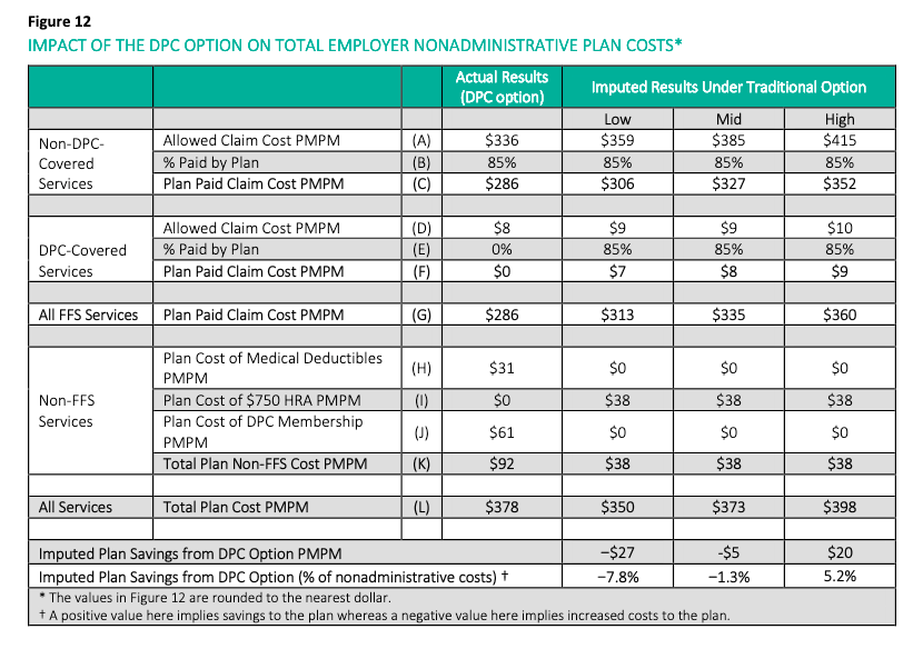 … [T]he introduction of a DPC option increased total nonadministrative plan costs for the employer by 1.3% after consideration of the DPC membership fee and other plan design changes for members enrolled in the DPC option.