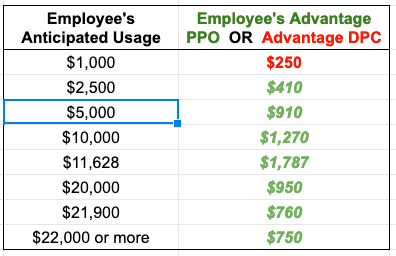 Peak DPC advantage reaches $750 annually where the FFS plan mOOP sets in just below $14,000 of annual utilization, and remains fixed at that level for all heavier utilizers. But even for far more moderate users, all the way down to $1500 annual total utilization, the annual savings for DPC enrollees will be at least $450 annually.