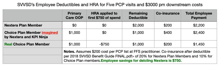 Employers other that the St Vrain Valley School District have also put forward direct primary care option programs where the DPC and FFS cohorts face different cost-sharing regimes. The foregoing paragraphs highlighted how the so-called analyst hired by Nextera failed two challenges raised by such differences. Foremost, mere shifts of claim costs between the employer and enrollees should not be taken as reflecting one way or the other on a DPC plan’s ability to reduce overall health care costs. That challenge can most be simply mitigated by basing plan cost comparison on the difference in total allowed claims costs, inclusive of both employer and members’ shares.